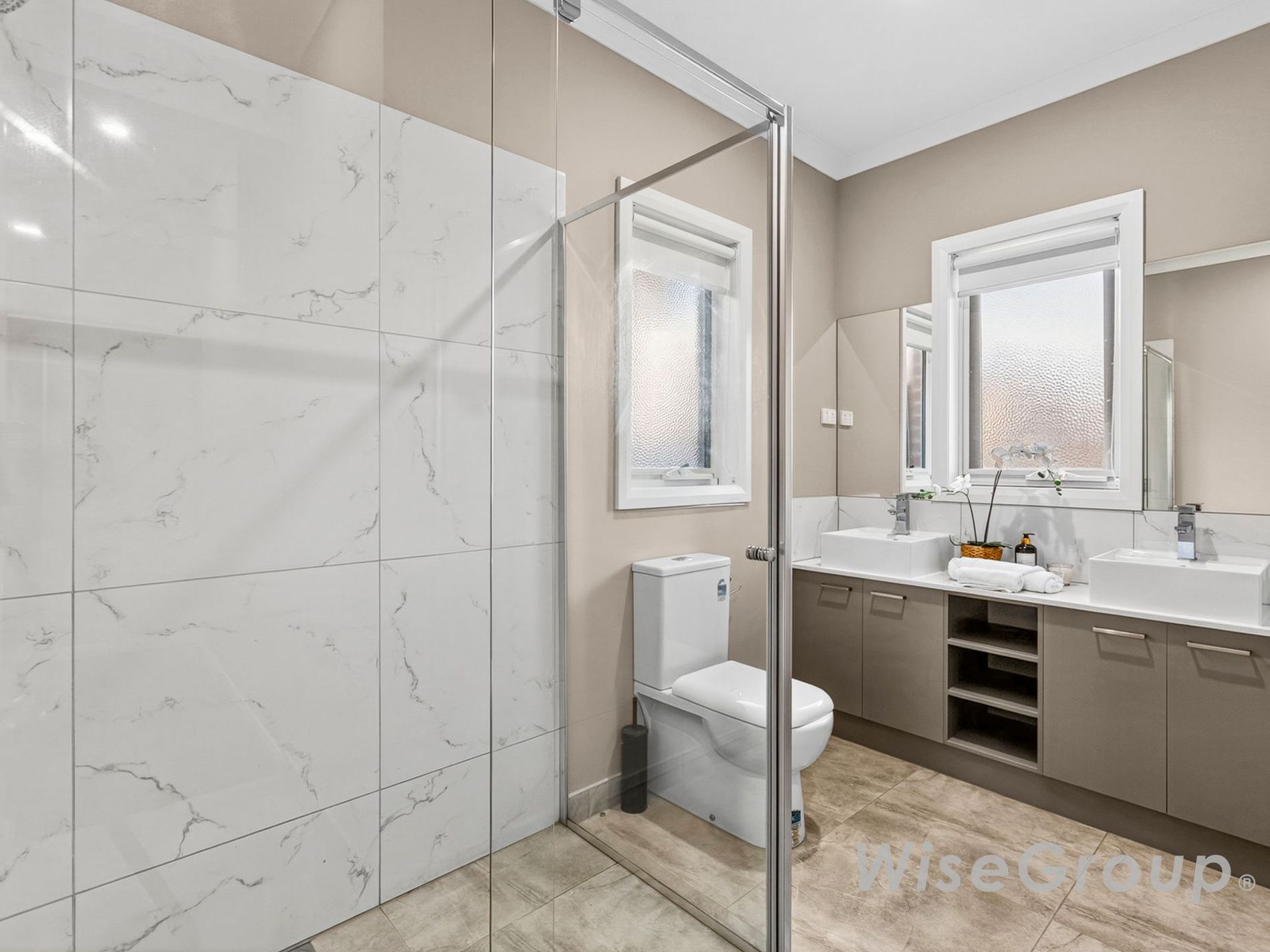 > Master bedroom features a large walk in robe and a private en-suite with Caesar-stone bench tops, double vanity and large shower.