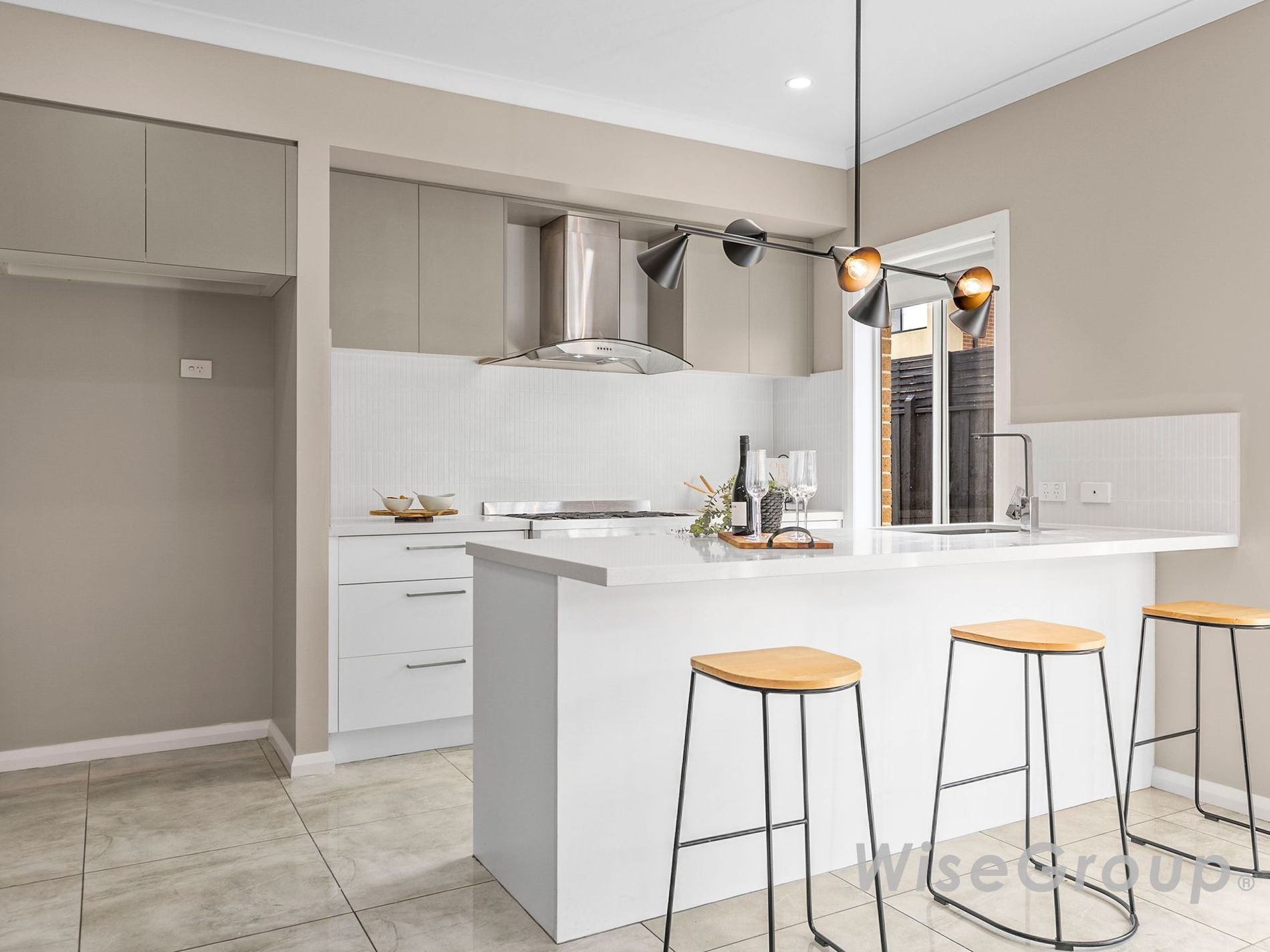 > A fully equipped kitchen featuring Caesar-stone bench-tops, stainless steel 900mm oven, cooktop & dishwasher.